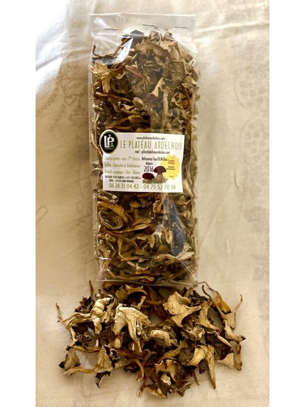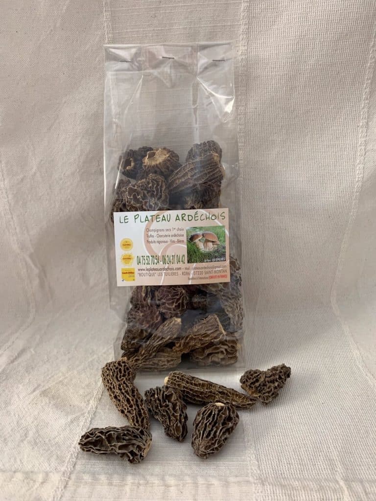 Vente de champignons secs, produits du terroir Ardéchois, charcuteries, truffes, vins. Grand choix de variétés, cèpes, morilles, morillons, verpes de bohème, girolles, mousserons, chanterelles, trompettes des maures, mélange forestier, etc...
