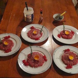 - Répartissez ce steak tartare en quatre galettes aplaties sur les assiettes, creusez un peu le dessus pour y déposer le jaune d’œuf et les câpres. Saupoudrez de parmesan a votre guise …